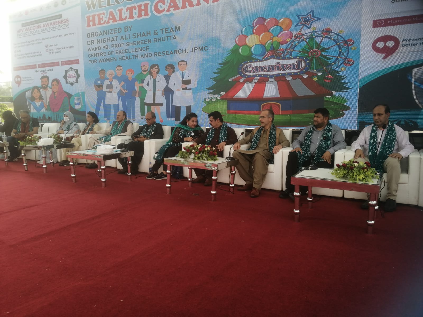 The carnival included a wide range of public health initiatives such as general health check-ups, preventive screenings, HPV awareness and vaccination guidance, cardiac evaluations, maternal and child health counseling, and a blood donation camp for patients requiring urgent transfusions at JPMC.