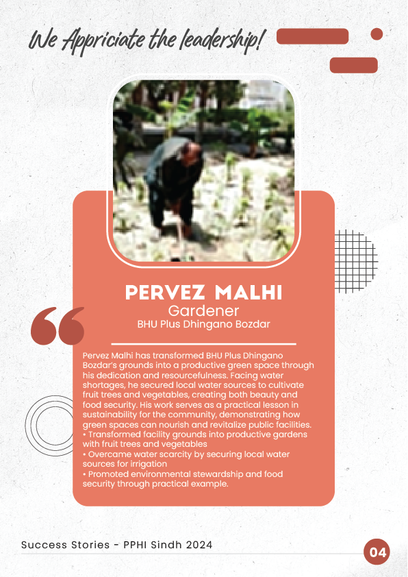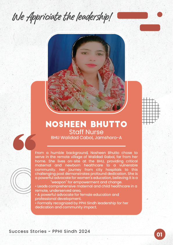 1. Nosheen Bhutto - Staff Nurse at BHU Walidad Cabol. From city hospitals to remote villages, she champions maternal care and women's education.