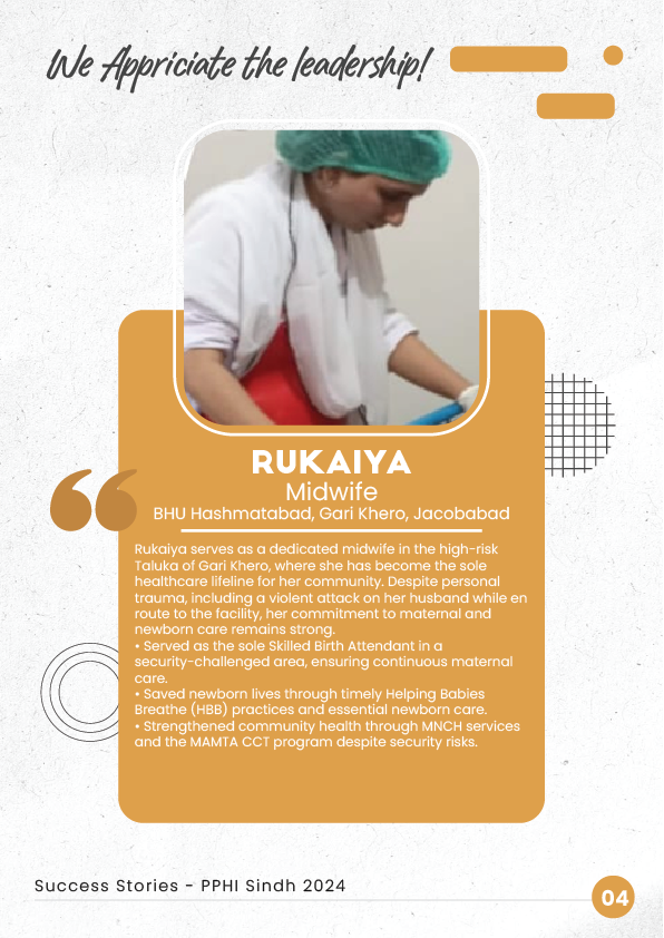 4. Rukaiya - Midwife serving in high-risk Jacobabad, saving newborns with HBB training.